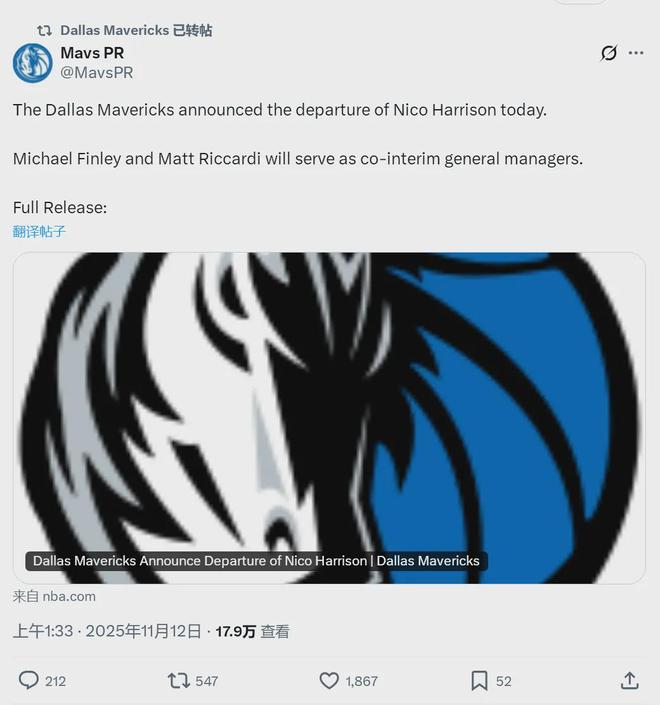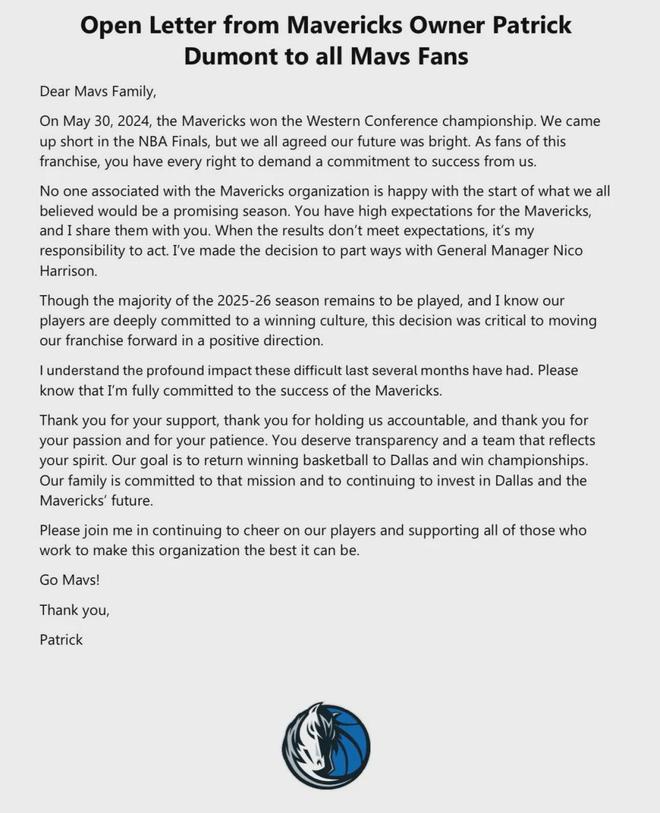 迈克尔-芬利和马特-里卡迪,成为独行侠临时总经理。截至教主发稿,独行侠3胜8负排名西部倒数第二,战绩仅好于2胜8负的鹈鹕。独行侠老板杜蒙特发表公开信:全队上下都无法接受这个糟糕的开局,我必须采取行动,解雇哈里森!