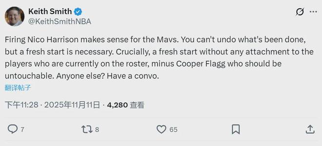 自从东契奇和浓眉的交易达成之后,湖人取得30胜16负,独行侠只有16胜28负。另一记者Keith Smith认为:“独行侠解雇哈里森是正确选择,他必须为独行侠的烂摊子负责。独行侠应该开启交易谈判,除了弗拉格,其他都能放上谈判桌。”