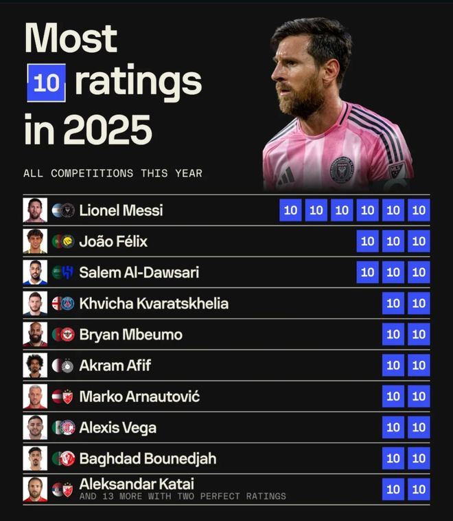 11月10日。有著名评分机构sofascore统计并公布他们今年给出的所有满分10分排行榜,并没有区分联赛,而是全世界一起来。其中已经不在五大联赛的历史第一人梅西凭借在快退役但依旧没退化的世界第一档表现,踢出了世界第一的满分10分次数,而且是独一档,一共有6次。超过所有五大联赛超巨。第二是巴萨见五大联赛弃将、C罗大腿、葡萄牙国脚、利雅得胜利最佳球员、沙特MVP候选菲利克斯,一共3次。