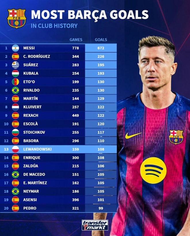 北京时间11月11日,在莱万多夫斯基用帽子戏法帮助巴塞罗那客场4-2战胜塞尔塔之后,德转列出了巴萨队史射手榜排名前20的球员,梅西断崖式领先,莱万以108球与路易斯-恩里克并列第14位。